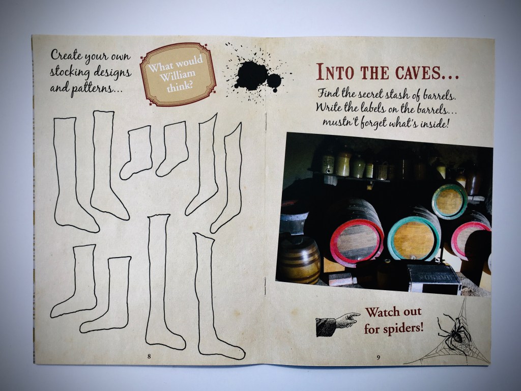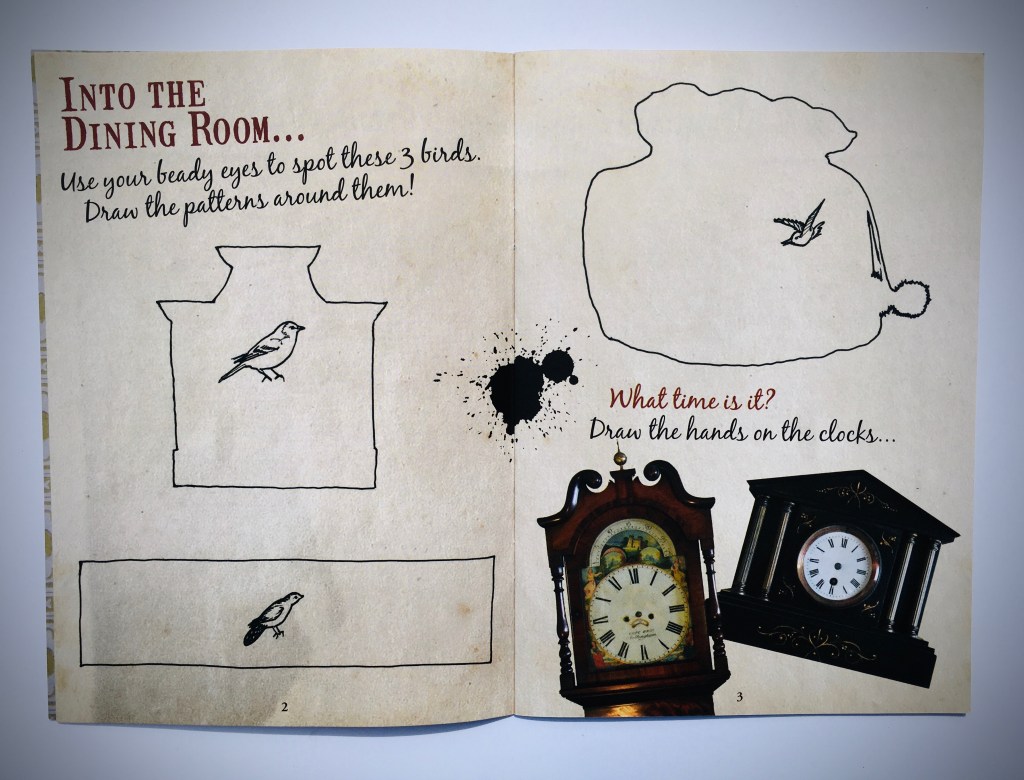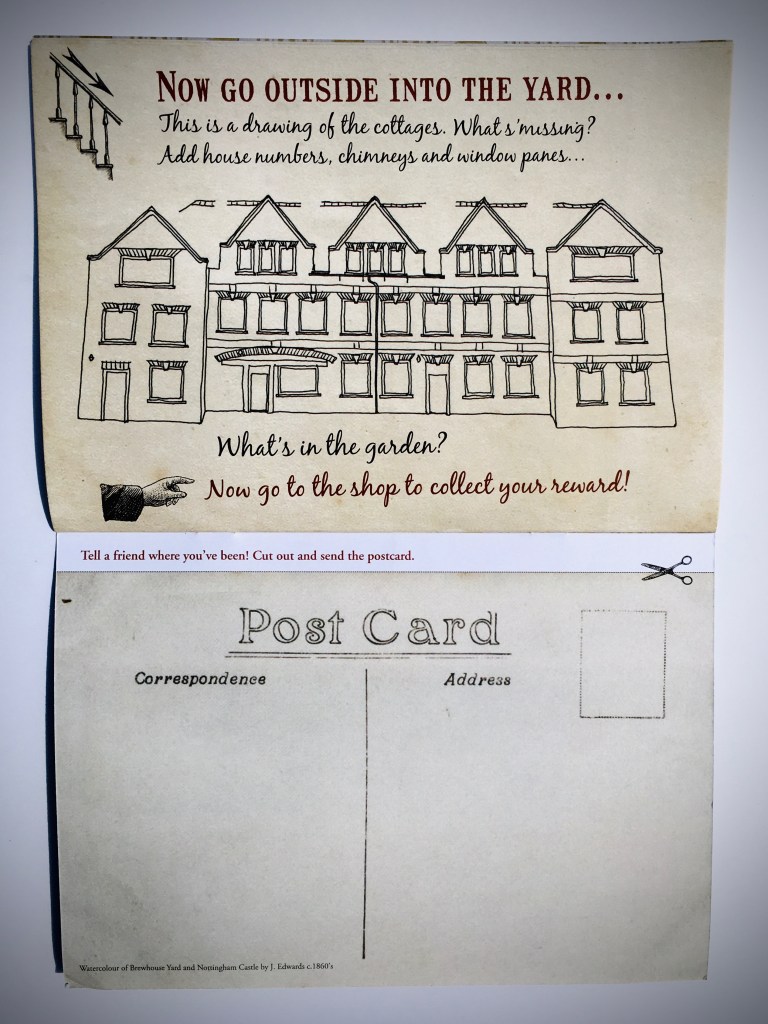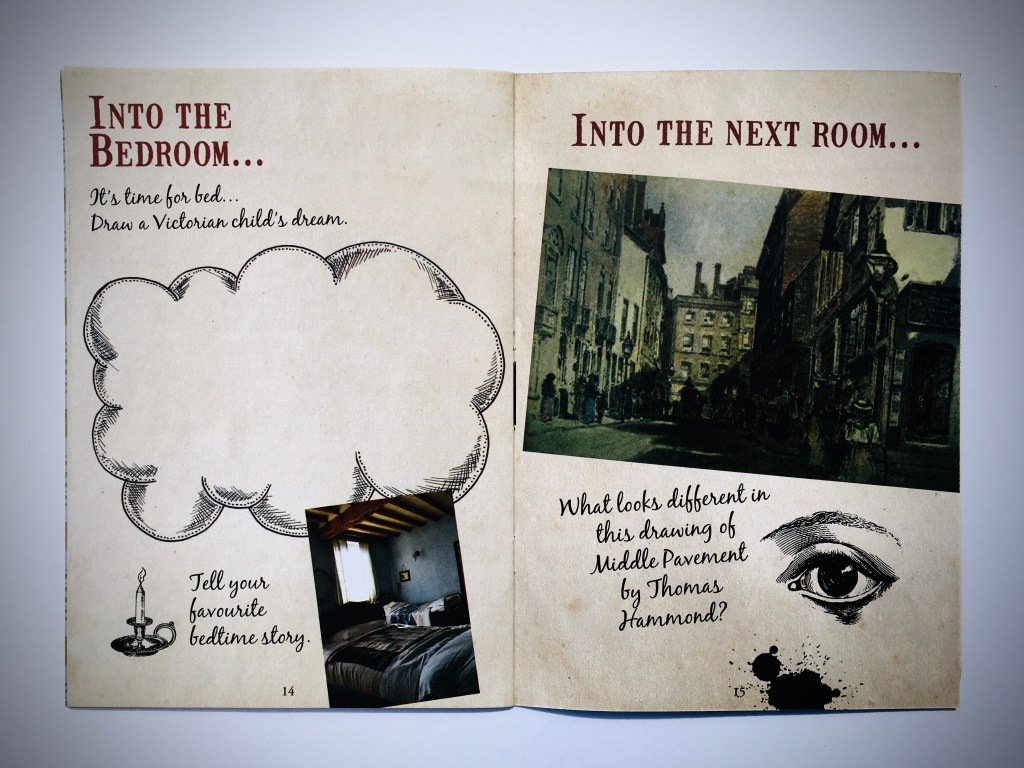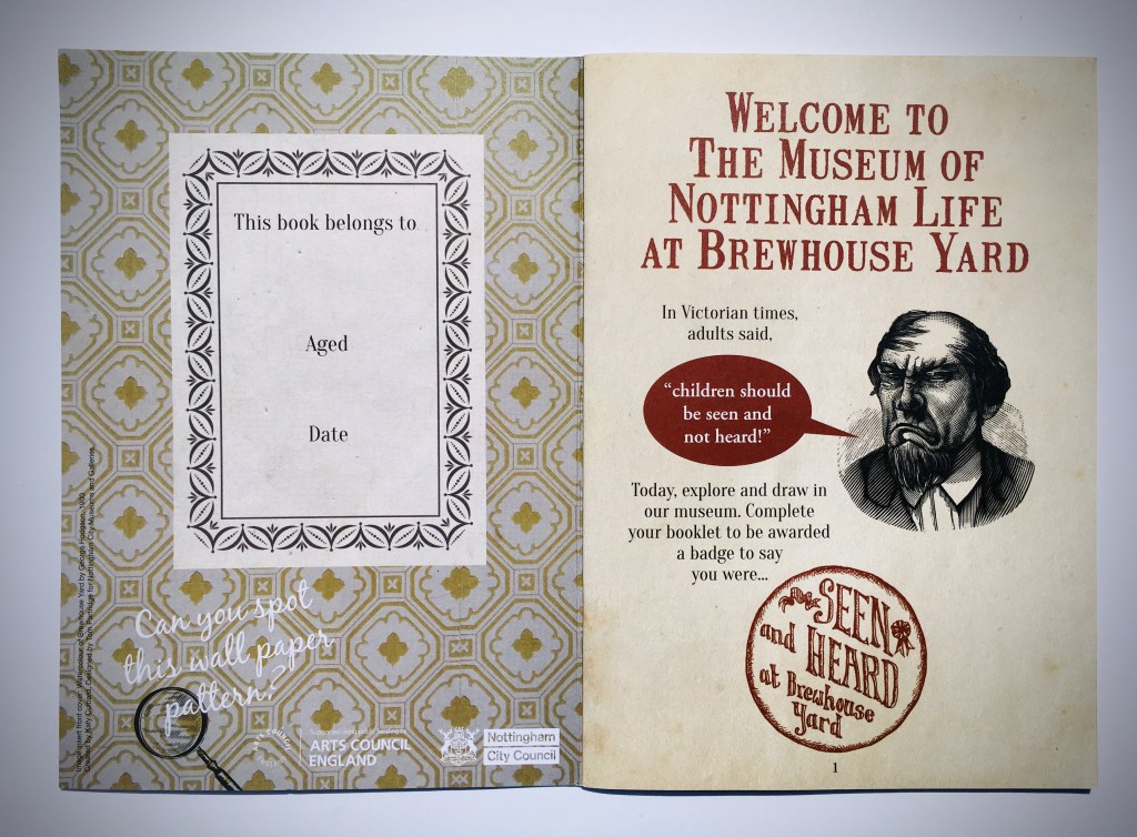 An A5 children’s activity book for families visiting the Museum of Nottingham Life at Brewhouse Yard, Nottingham. Activities include spotting and drawing patterns, objects, words; observing the time on clocks; imagining, talking about and drawing memories; drawing stocking designs; spot the difference; and writing a postcard. The activities draw attention to past occupants’ lifestyles and professions, the building, contents and decoration.