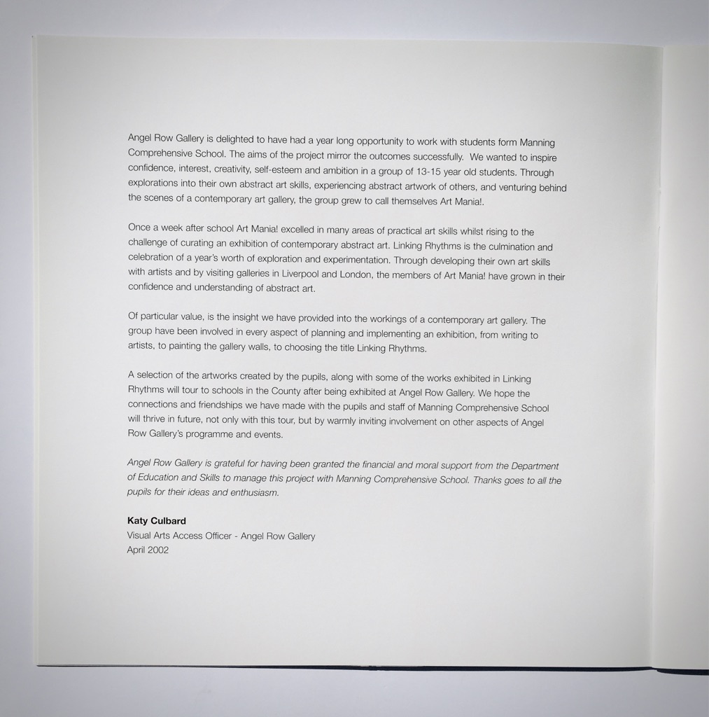 Planning and organising creative activities for students with local artists, both in school and at the gallery. Organising the installation of an exhibition and overseeing the devising and production of a printed publication.