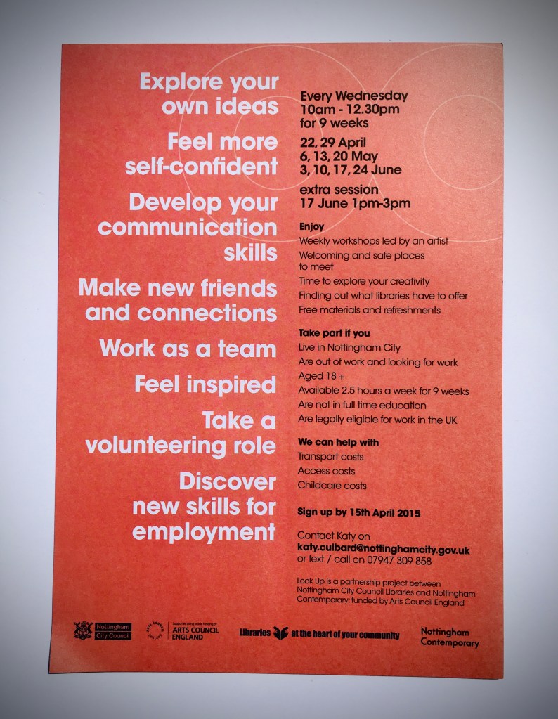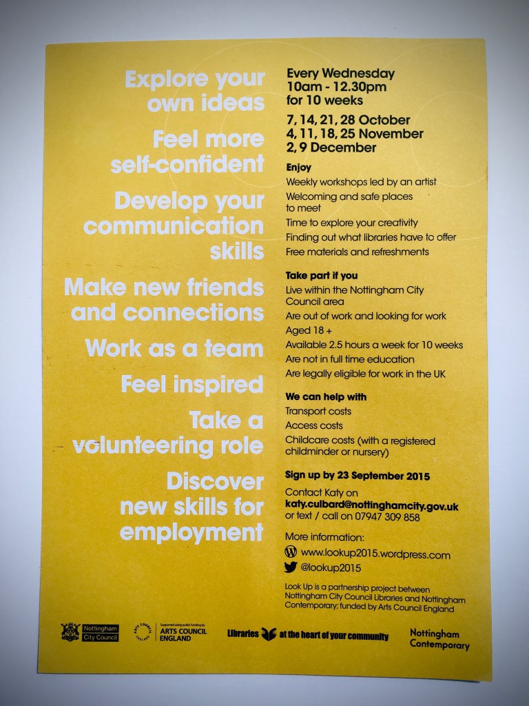 Ten-week artist-led creative projects inspiring unemployed adults to look for work in new ways. Using the resources at a contemporary art gallery and local libraries to explore personal and career aspirations, and make new artworks for exhibitions in libraries.